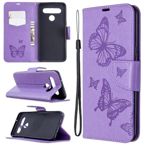 Funda de Cuero para LG K61 Two Butterflies con Tapa Horizontal, Soporte, Ranura para Tarjeta, Billetera y Cordón (Púrpura)