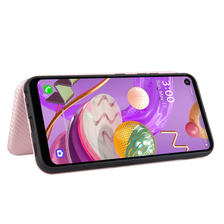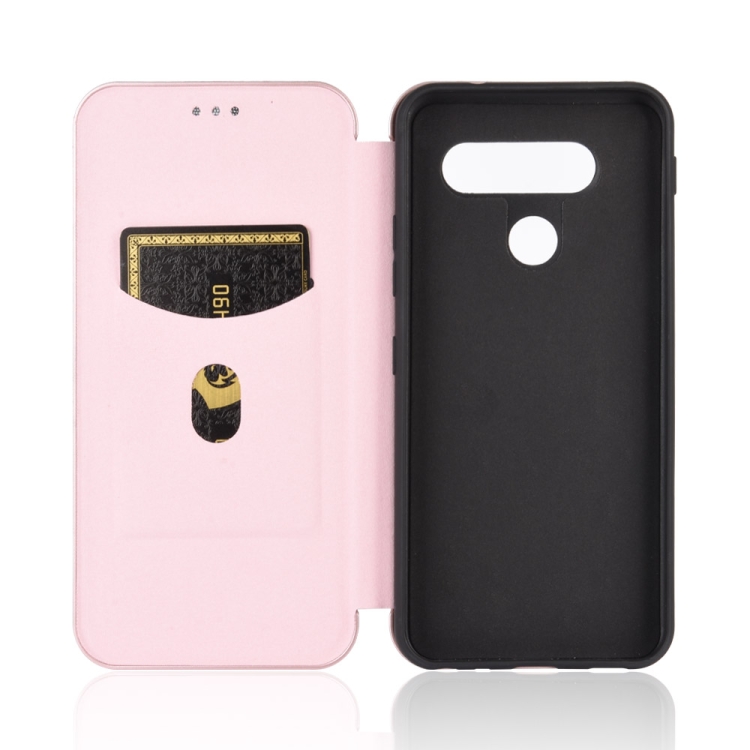 Funda de Cuero para LG Q70 con Tapa Magnética Horizontal y Textura Fibra de Carbono (Negra)
