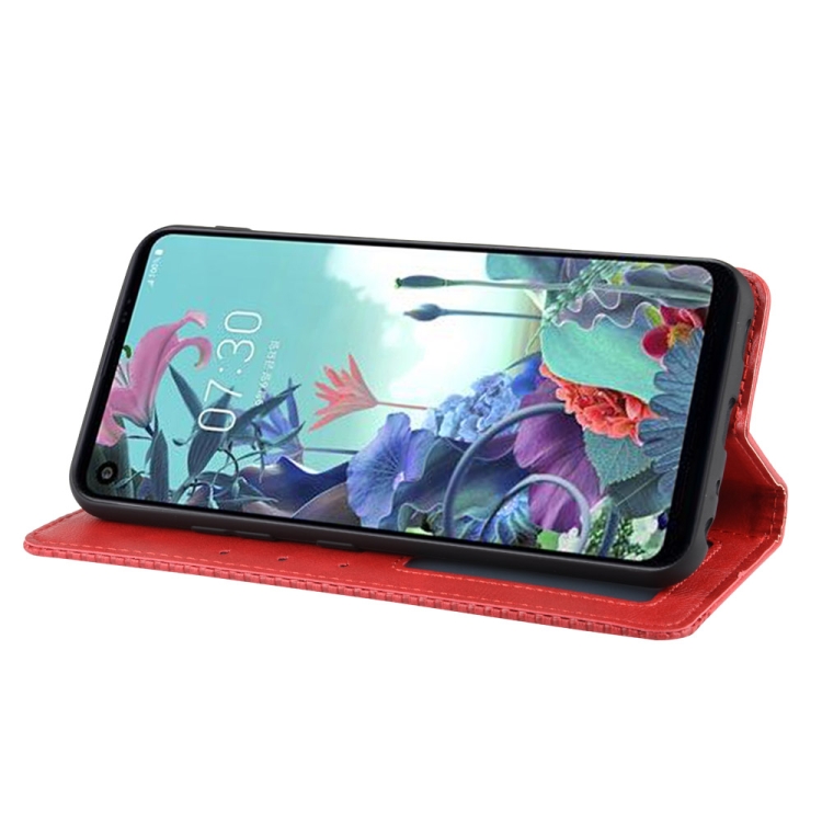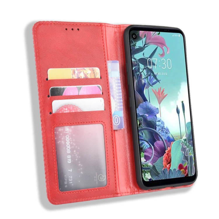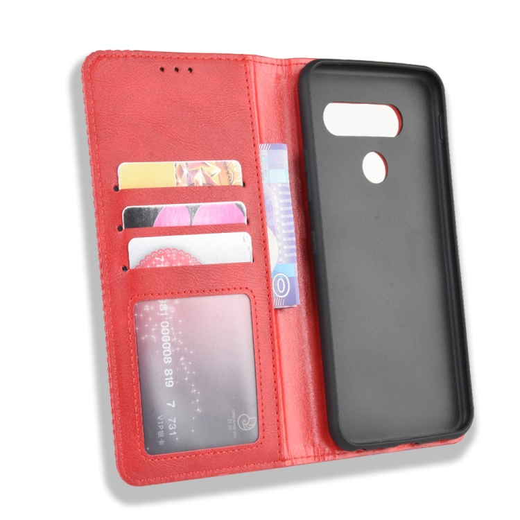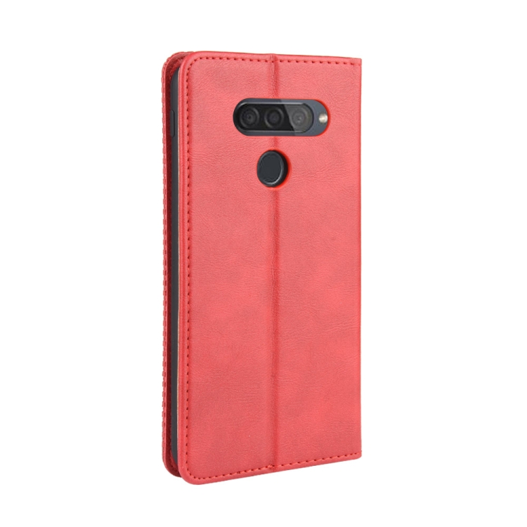 Funda de Cuero para LG Q70 con Hebilla Magnética, Tapa Horizontal, Soporte, Ranuras para Tarjetas y Marco de Fotos (Rojo)
