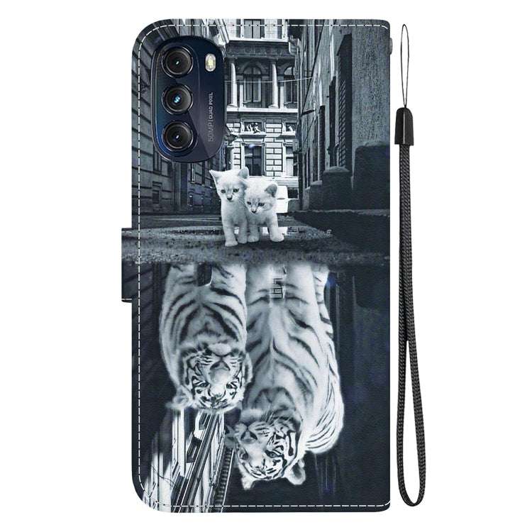 Funda de Cuero para Motorola Moto G 2022 con Dibujo Coloreado y Textura de Cristal (Reflejo de Tigre Gato)