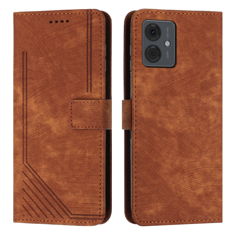 Funda de Cuero para Motorola Moto G14 con Patrón de Rayas y Cordón (Marrón)