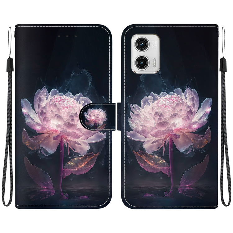 Estuche de Cuero para Motorola Moto G73 con Dibujo Coloreado y Textura de Cristal (Peonía Púrpura)