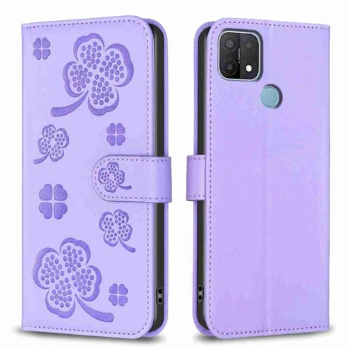Para Oppo A15 Funda de Cuero con Relieve de Cuatro Hojas (Púrpura)
