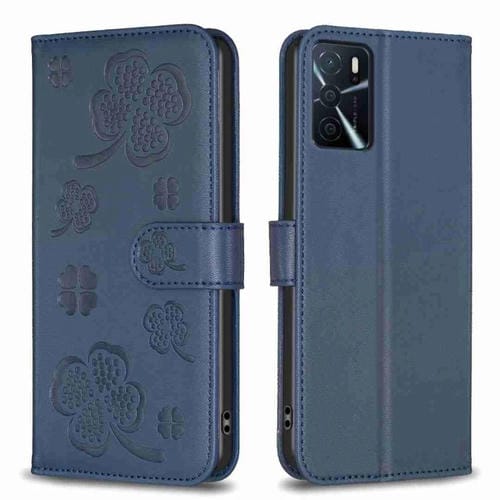 Para Oppo A16 / A16S / A54S Funda para Teléfono de Cuero con Relieve de Cuatro Hojas (Azul)
