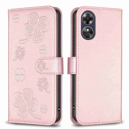 Para Oppo A17 Funda de Cuero con Relieve de Cuatro Hojas (Rosa)