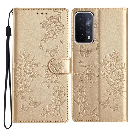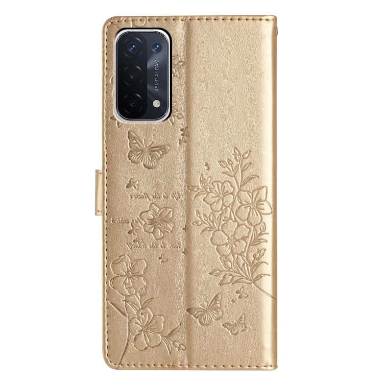 Para Oppo A74 5G / A54 5G Funda para Teléfono de Cuero con Relieve de Flor de Amor y Mariposa (Dorado)