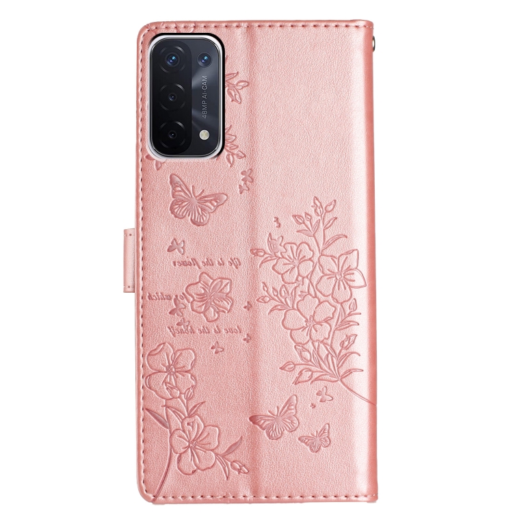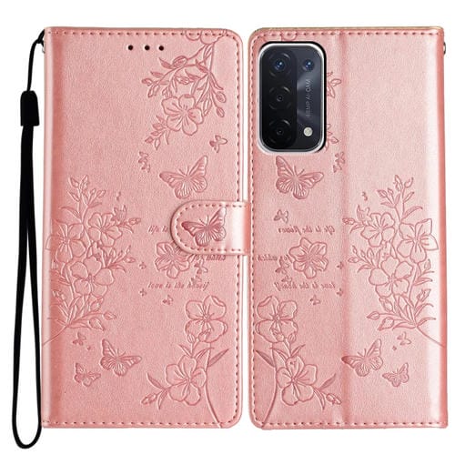 Para Oppo A74 5G / A54 5G Funda para Teléfono de Cuero con Relieve de Flor de Amor y Mariposa (Oro Rosa)