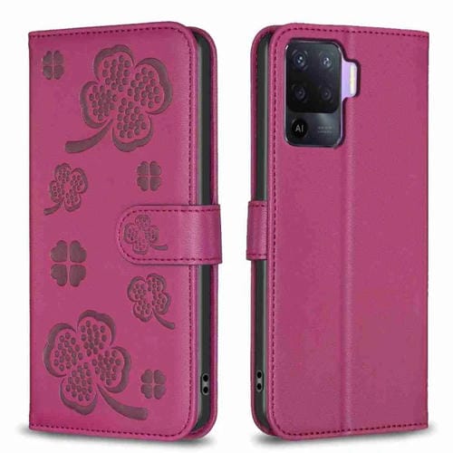 Para Oppo A76 5G / A36 4G Funda de Cuero con Relieve de Cuatro Hojas para Teléfono (Rojo Rosa)