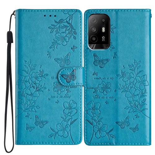 Para Oppo A94 5G Funda para Teléfono de Cuero con Relieve de Flor de Amor y Mariposa (Azul)