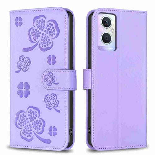 Para Oppo A96 5G / Reno7 Z Funda para Teléfono de Cuero con Relieve de Cuatro Hojas (Púrpura)