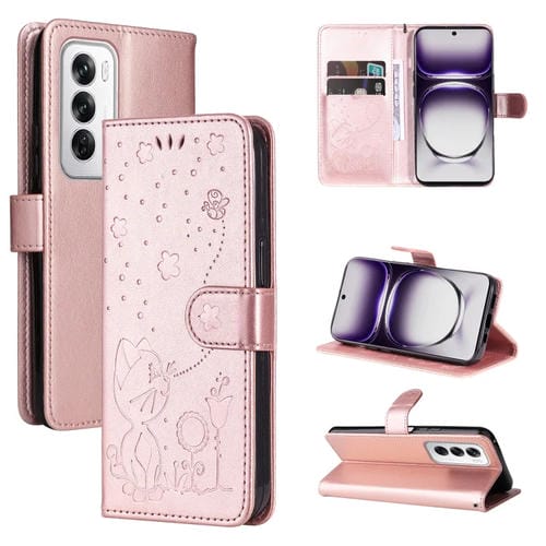 Para Oppo Reno12 5G Global Cat And Bee Funda de Cuero con Tapa En Relieve (Oro Rosa)