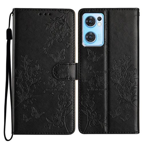 Para Oppo Reno7 5G Butterfly Love Flower Funda de Cuero En Relieve para Teléfono (Negro)
