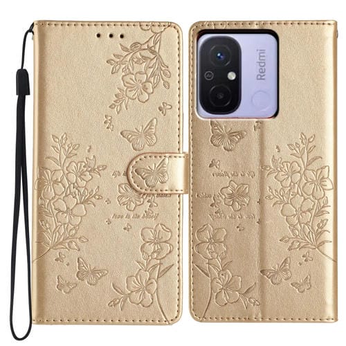 Para Redmi 12C Funda de Cuero para Teléfono con Mariposas y Flores (Dorado)