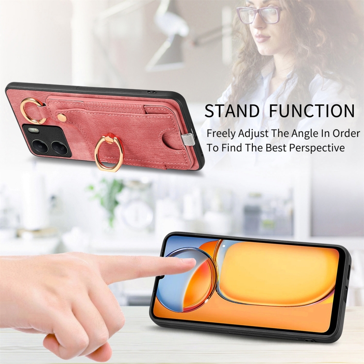 Para Redmi Note 12 Turbo Retro Skin-Feel Ring Card Bag Funda para Teléfono con Lazo para Colgar (Rosa)