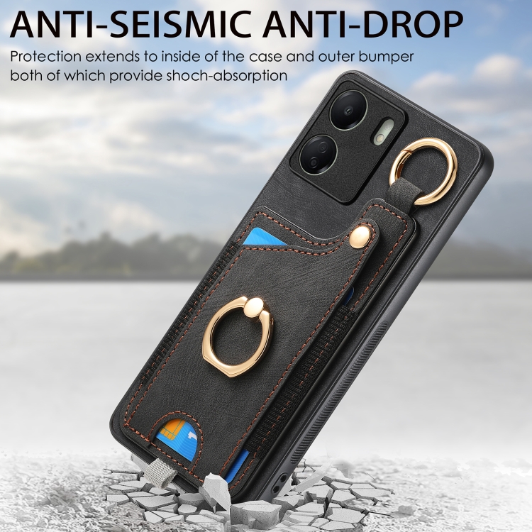 Para Redmi Note 9 4G Funda para Teléfono con Bolsa para Tarjeta con Anillo y Sensación de Piel Retro con Lazo para Colgar (Negro)
