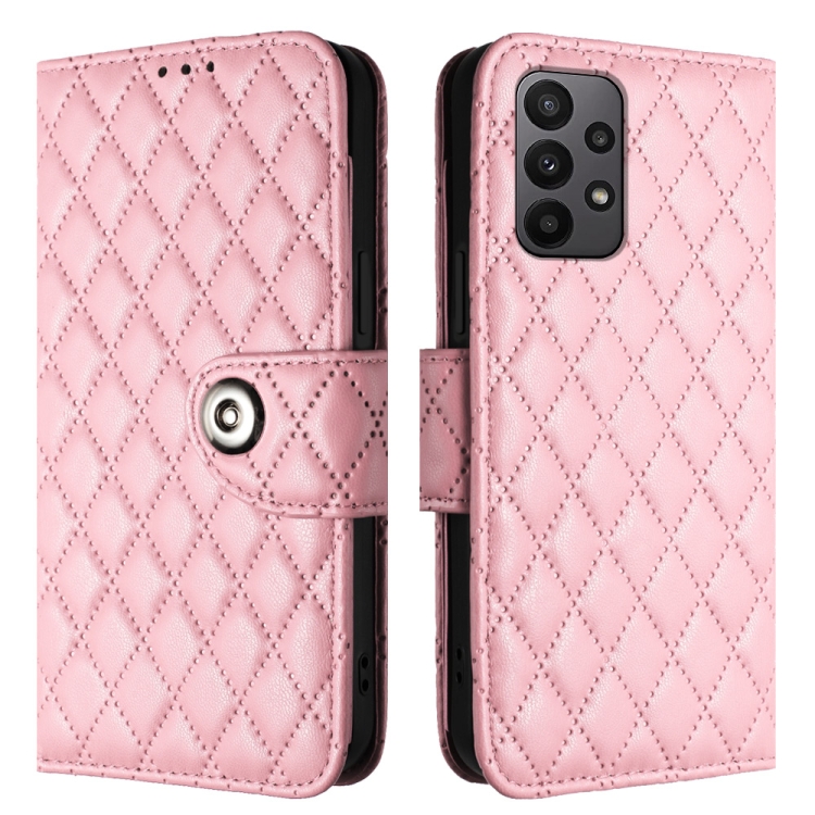 Funda para Teléfono Samsung Galaxy A13 4G y 5G con Tapa de Cuero Textura Rómbica y Cordón (Rosa)