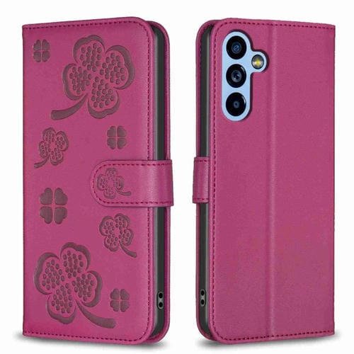 Funda de Cuero Samsung Galaxy A14 Relieve Cuatro Hojas (Rojo Rosa)