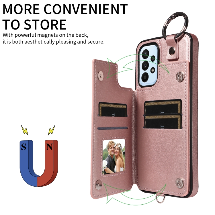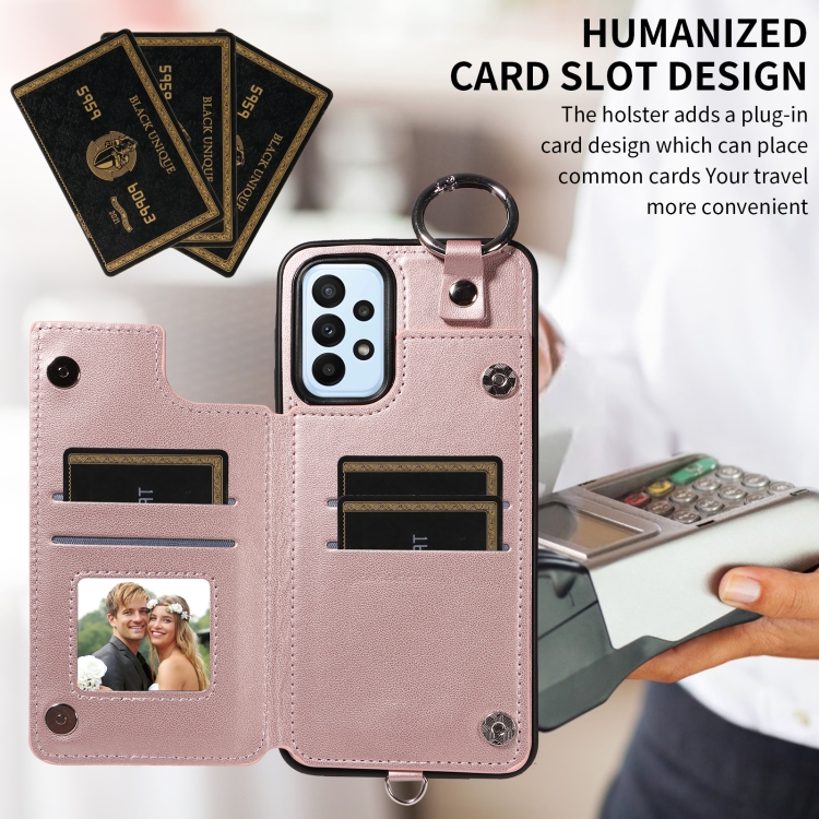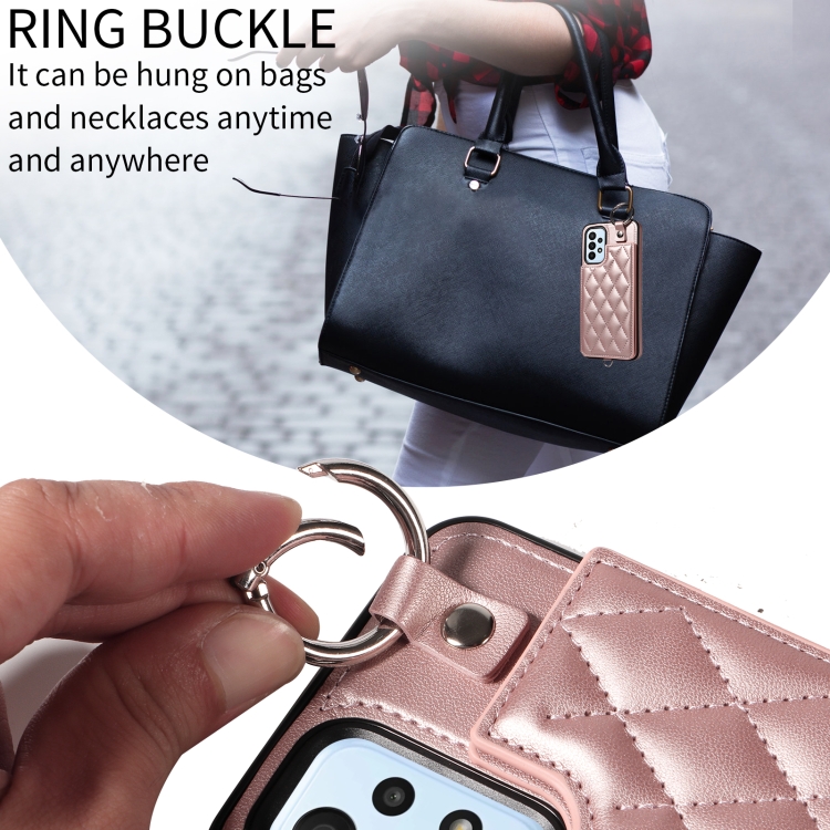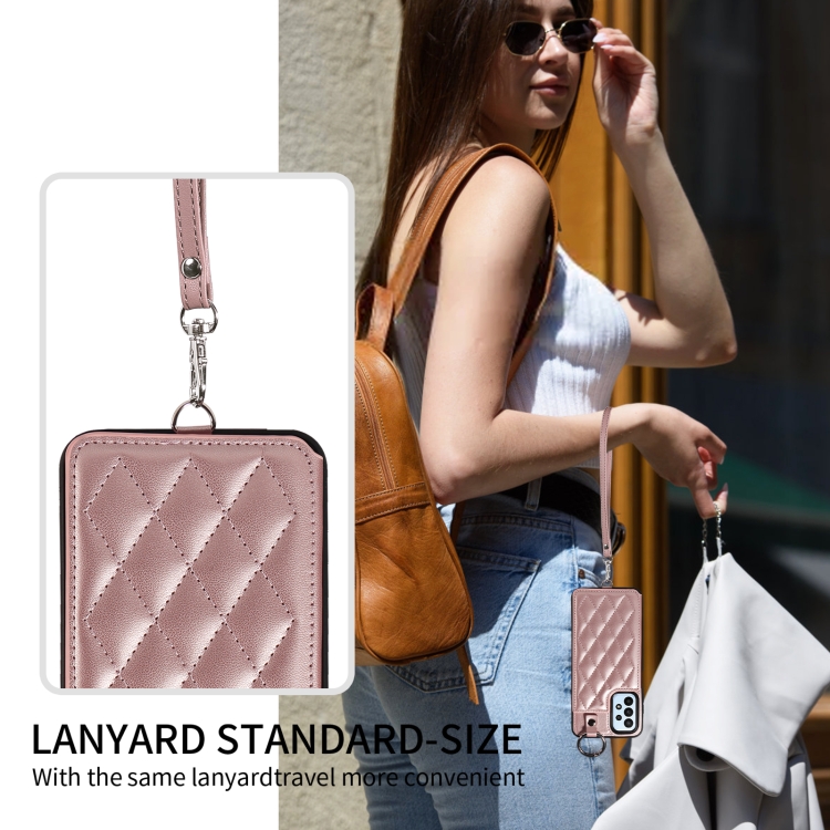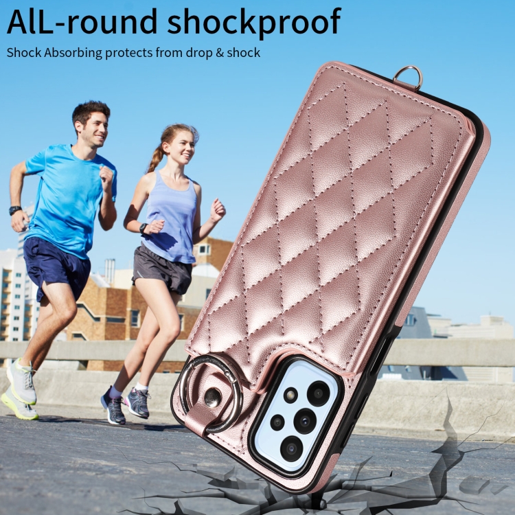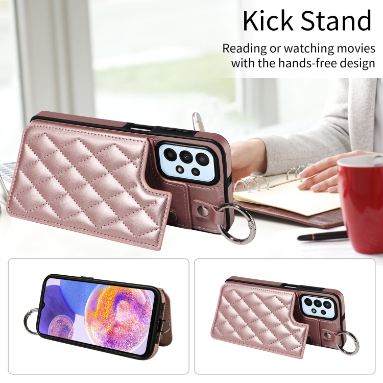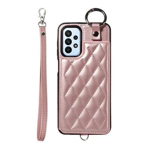 Estuche para Teléfono Samsung Galaxy A23 con Bolsa para Tarjetas Textura Rómbica y Cordón Corto (Oro Rosa)