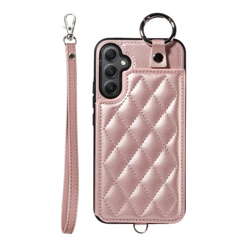 Estuche para Teléfono Samsung Galaxy A34 5G con Bolsa para Tarjetas Textura Rómbica y Cordón Corto (Oro Rosa)