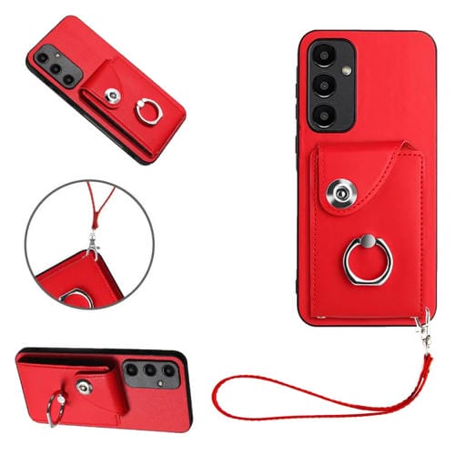 Funda para Teléfono Samsung Galaxy A35 de PU con Soporte para Anillo y Bolsa para Tarjeta con Cordón (Rojo)