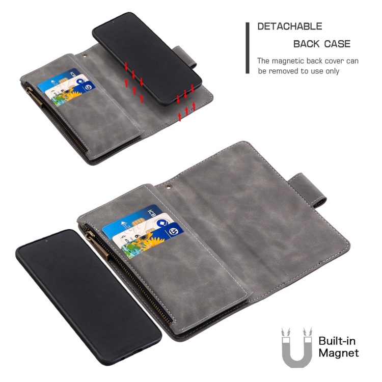 4. Diseño multifuncional, ranuras para tarjetas convenientes, billetera con cremallera, soporte, cubierta trasera protectora magnética desmontable.