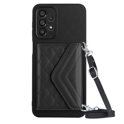 Estuche para Teléfono Samsung Galaxy A52 Rfid Bolsa para Tarjetas Textura Rómbica Cordón Largo (Negro)