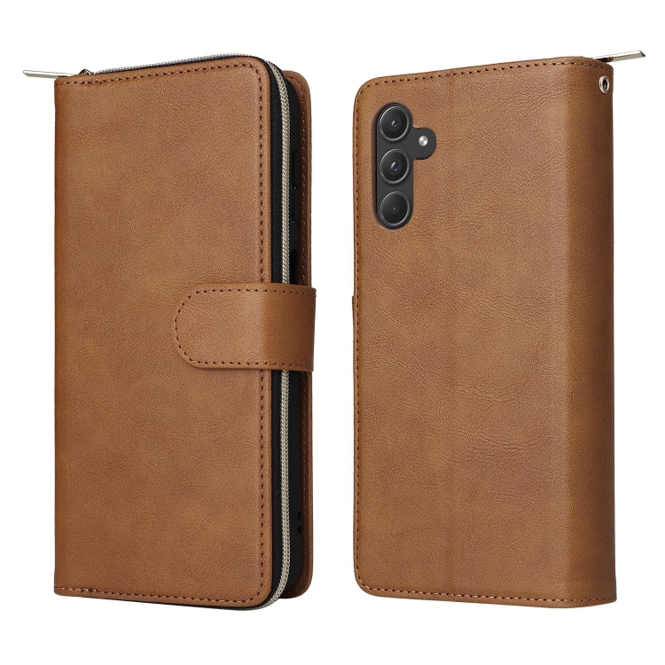 Funda de Cuero Samsung Galaxy A55 Bolsa Tipo Billetera con Cremallera y Ranuras para 9 Tarjetas (Marrón)