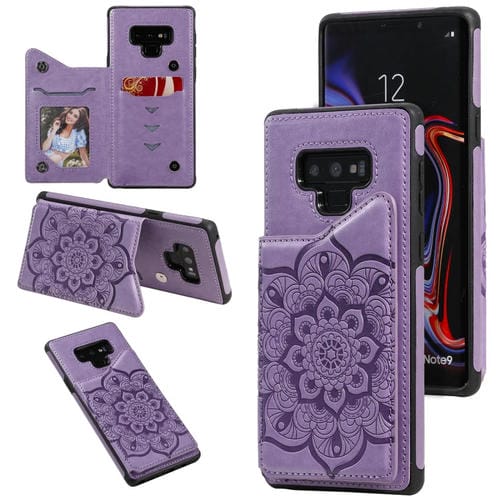 Estuche protector Samsung Galaxy Note 9 Estampado en relieve Flor Soporte Ranuras Tarjetas Marco Fotos (Púrpura)