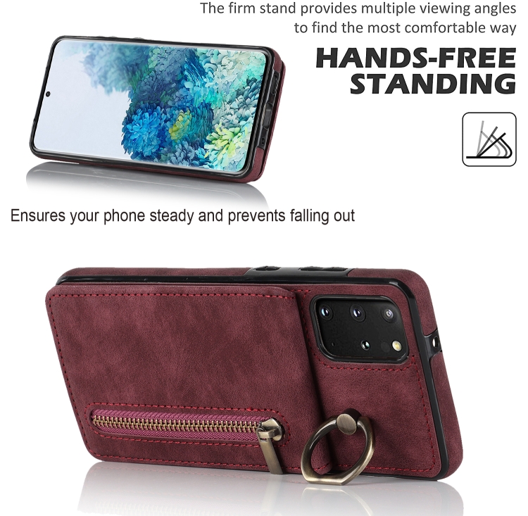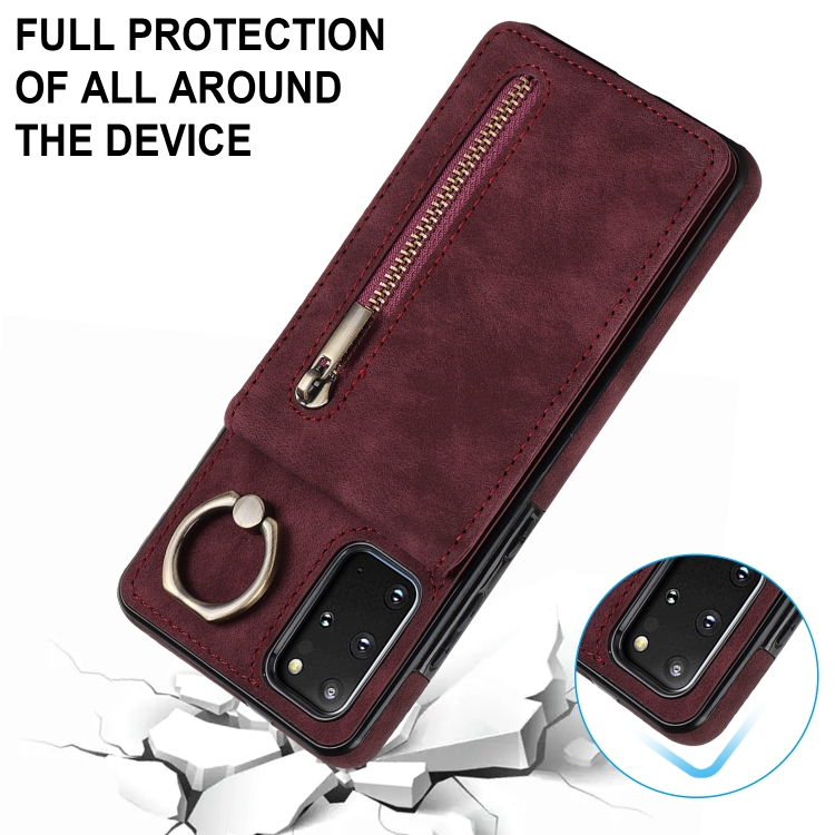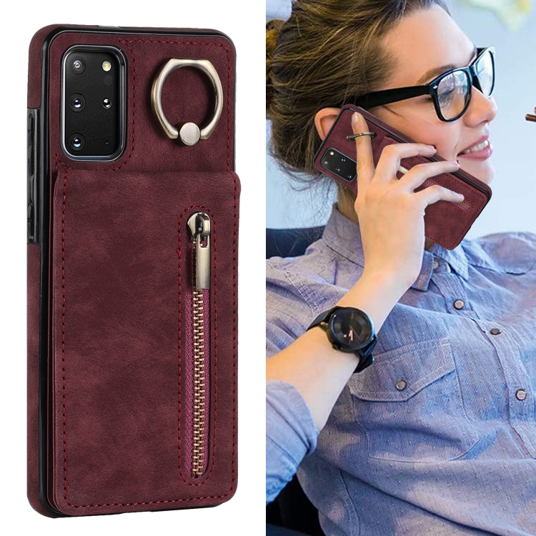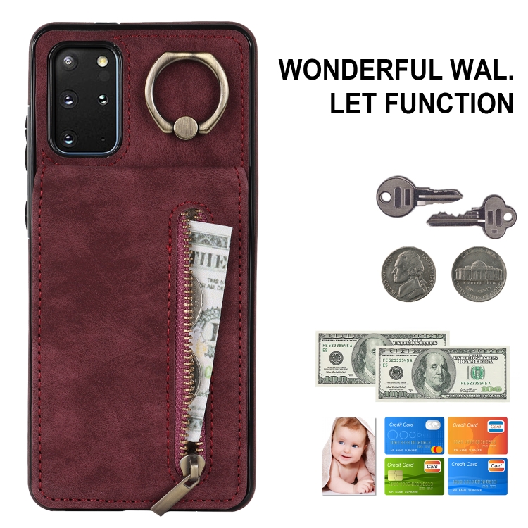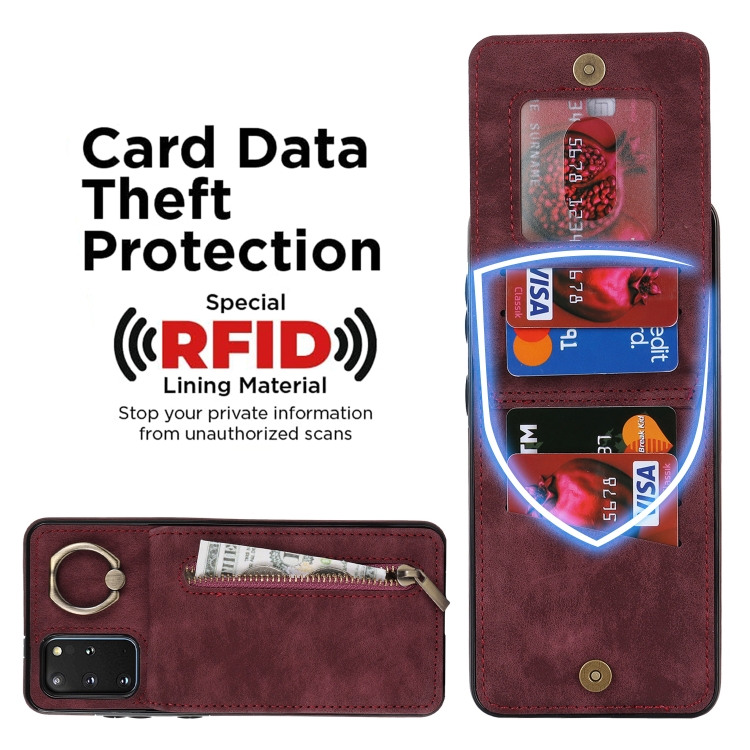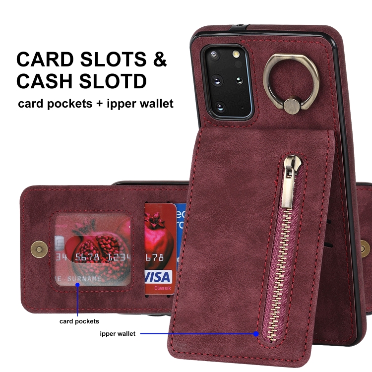 Estuche para Teléfono Samsung Galaxy S20+ con Ranura para Tarjeta Rfid, Anillo Retro y Cremallera (Rojo Vino)