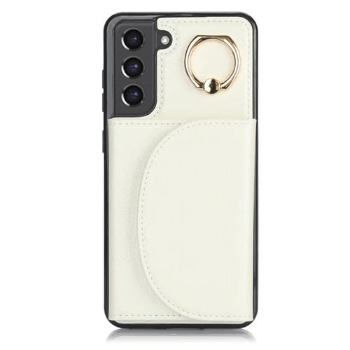 Estuche para teléfono Samsung Galaxy S21 FE 5G Ym007 con soporte para anillo y tarjeta con sensación de piel (Blanco)