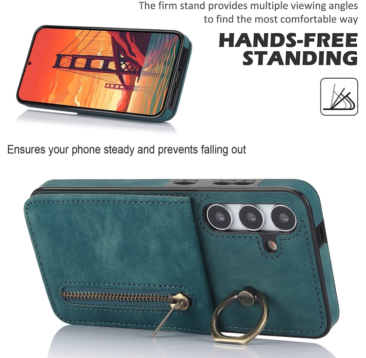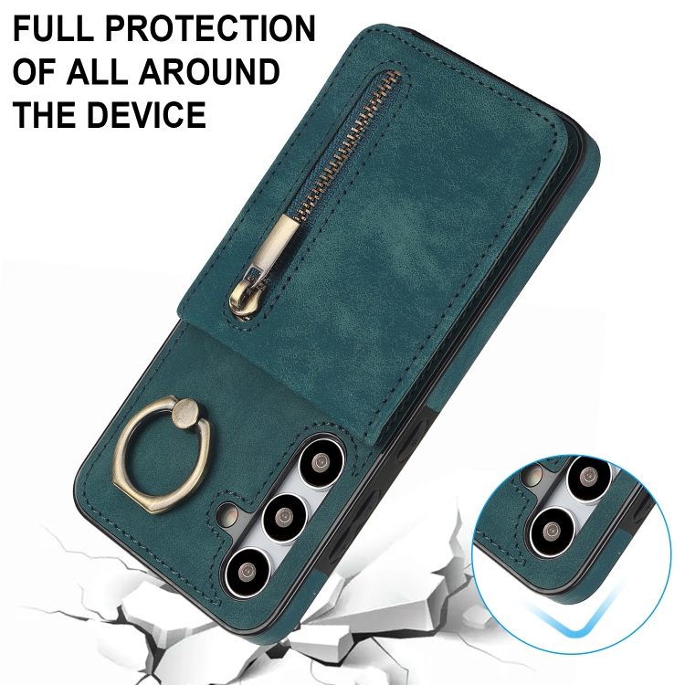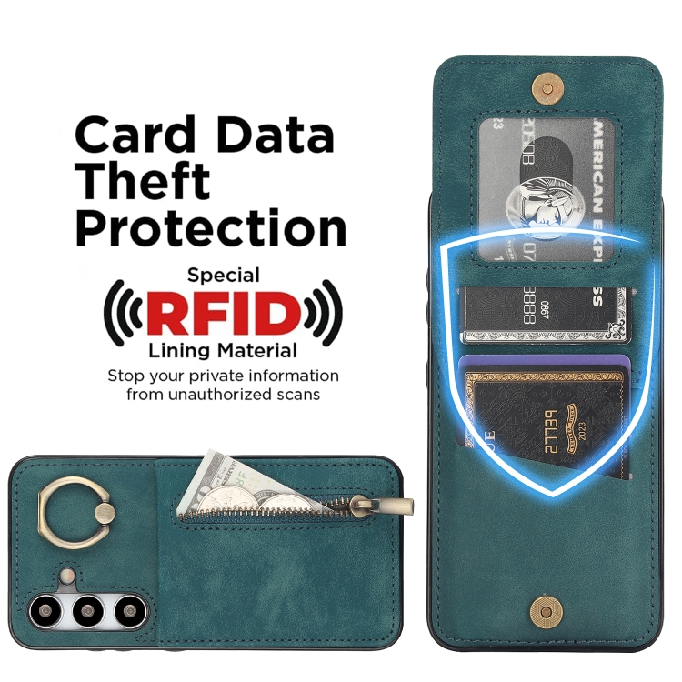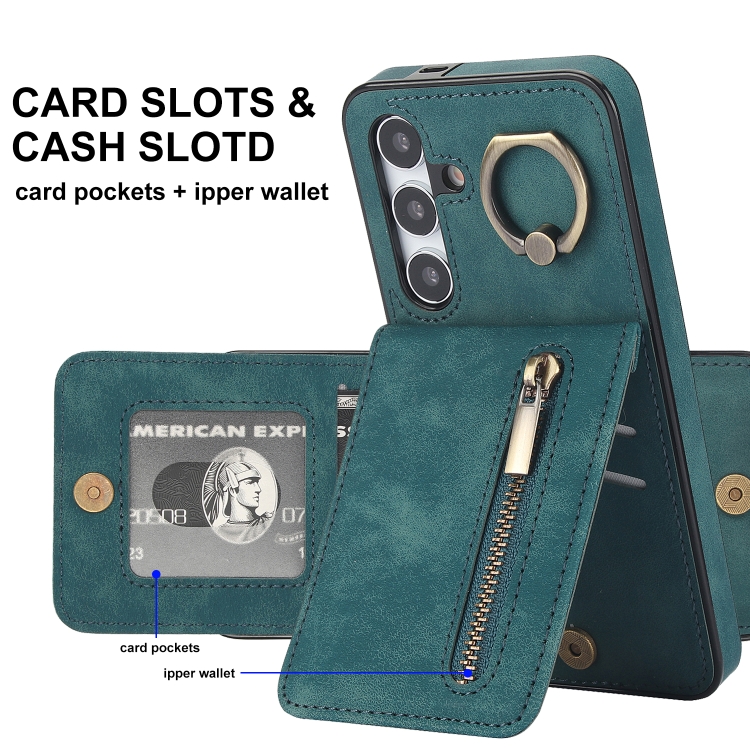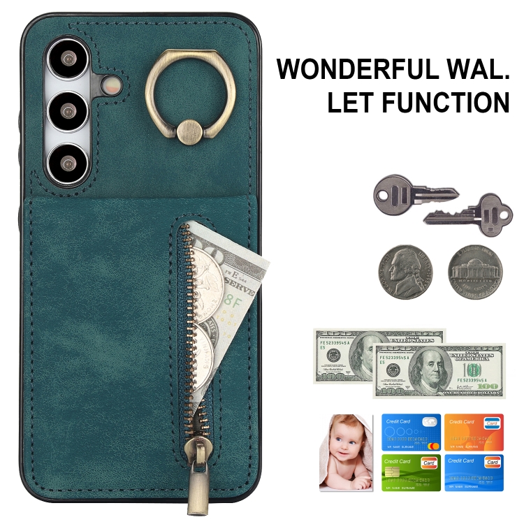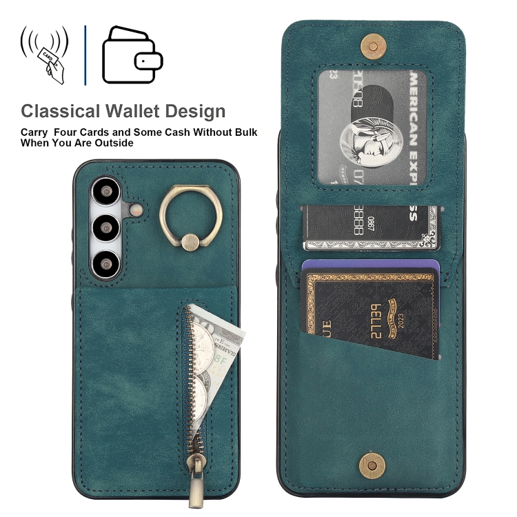 Estuche para Teléfono Samsung Galaxy S24 5G con Ranura para Tarjeta Rfid, Anillo Retro y Cremallera (Verde)