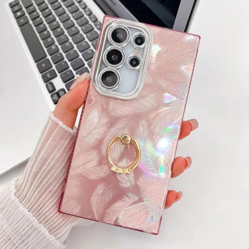 Estuche para Teléfono Samsung Galaxy S24 Ultra 5G TPU con Soporte para Anillo Textura Brillante y Película para Lentes (Plumas Rosas)