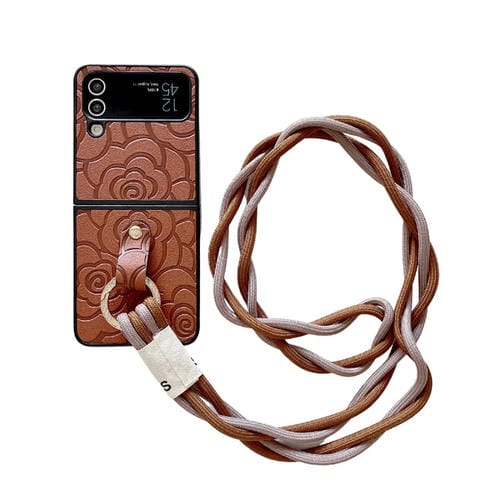 Funda Protectora Samsung Galaxy Z Flip3 5G Patrón Camelia con Cordón Largo y Anillo de Diamante (Marrón)