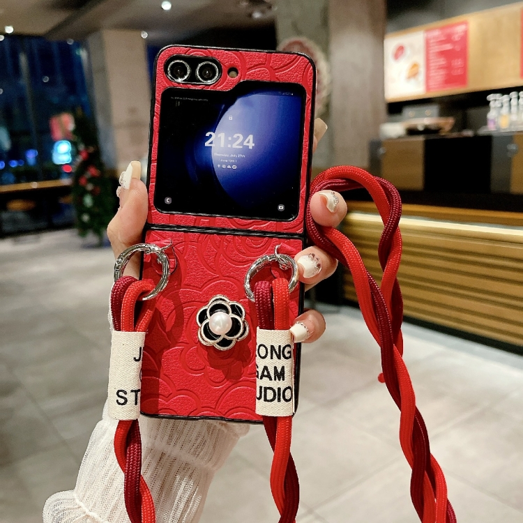 Funda Protectora Samsung Galaxy Z Flip3 5G Impression Camellia Pattern con Cordón Largo (Rojo)