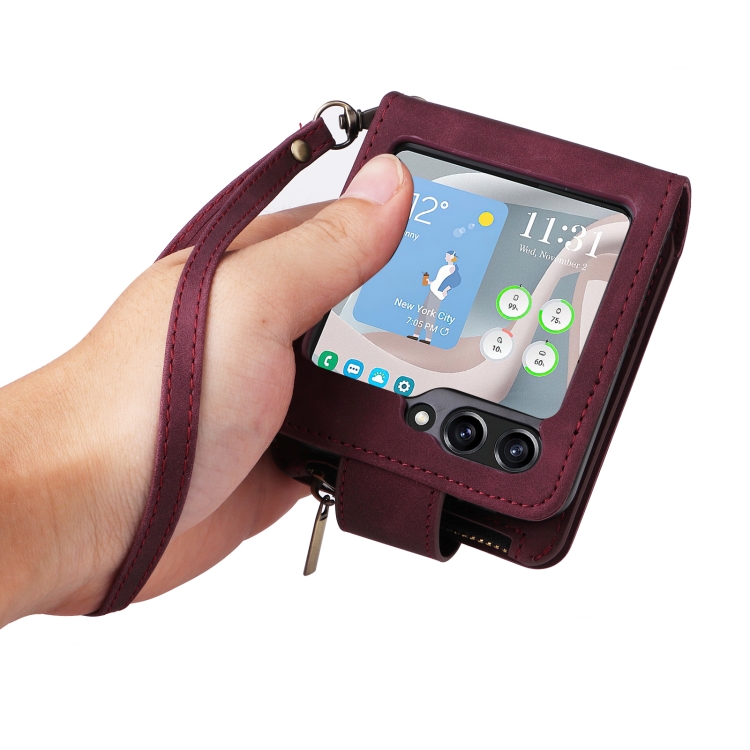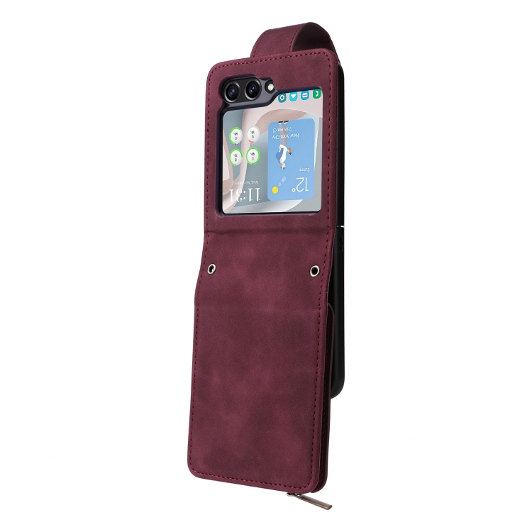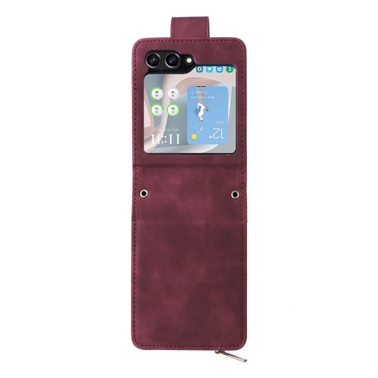 Funda para Samsung Galaxy Z Flip5 5G Crossbody de Cuero con Ranura para Tarjetas y Cremallera (Rojo Vino)