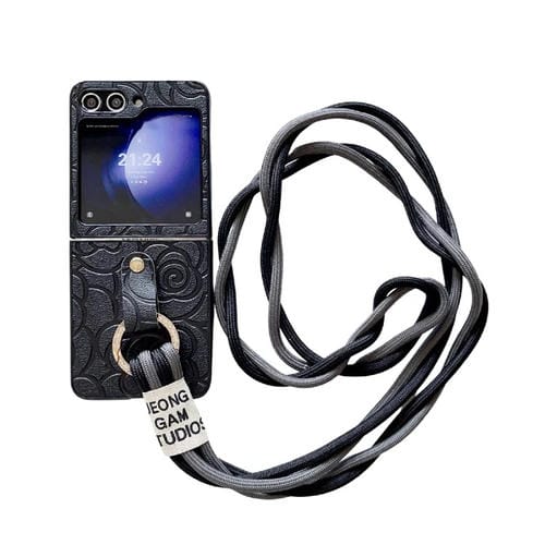 Funda Protectora Samsung Galaxy Z Flip5 5G con Patrón de Camelia, Cordón Largo y Anillo de Diamante (Negro)
