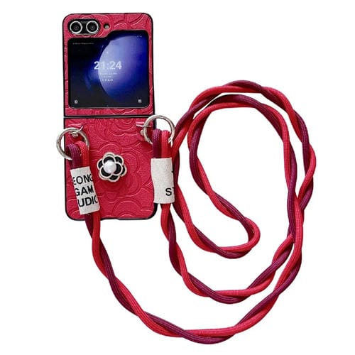 Funda Protectora Samsung Galaxy Z Flip5 5G Camellia Pattern con Cordón Largo (Rojo)