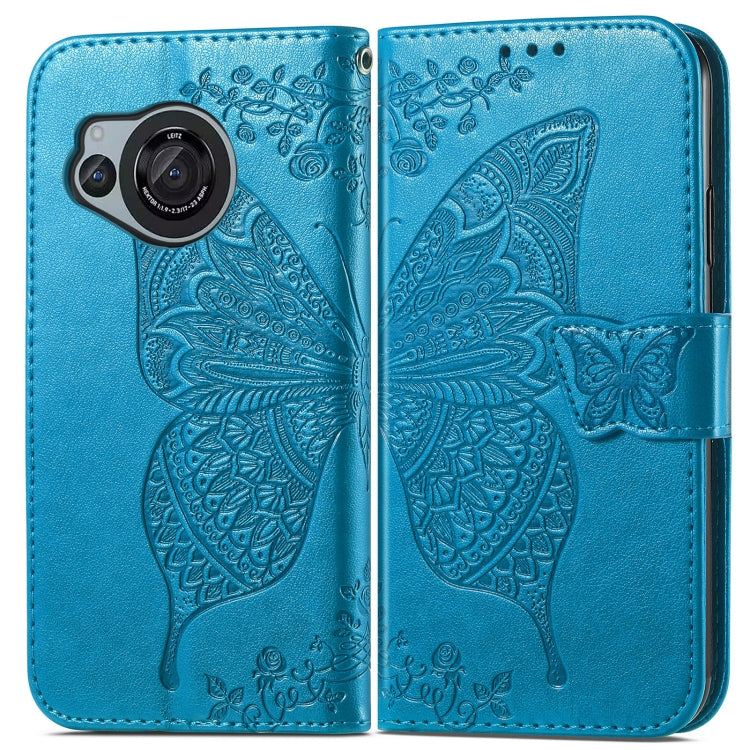 Estuche para Sharp Aquos R8 Butterfly Love Flower en Cuero En Relieve (Azul)