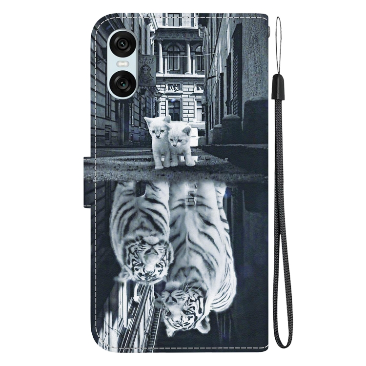 Estuche para Sony Xperia 10 Vi de Cuero con Dibujo Coloreado y Textura de Cristal (Reflejo de Tigre Gato)