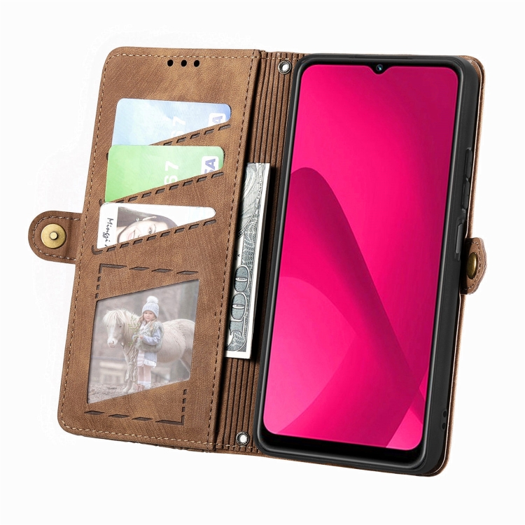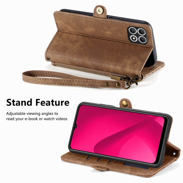 Funda de Cuero para T-Mobile Revvl 7 5G con Hebilla Lateral y Billetera con Cremallera (Marrón)