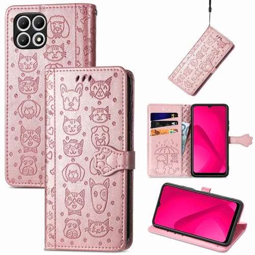 Funda de Cuero para T-Mobile T Phone 2 5G con Relieve Perros y Gatos (Oro Rosa)