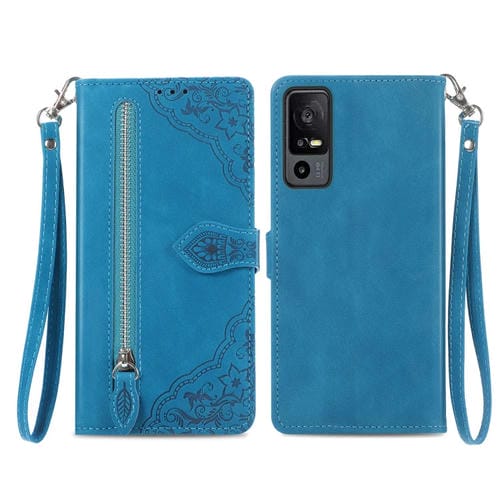 Funda de Cuero para TCL 40 Xe con Cremallera y Flores en Relieve (Azul)