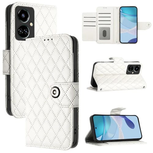 Funda de Cuero para Tecno Camon 19 con Tapa Textura Rombal y Cordón (Blanco)