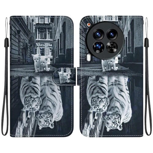 Funda de Cuero para Tecno Camon 30 Premier 5G con Dibujo Colorido y Textura de Cristal (Reflejo de Tigre Gato)
