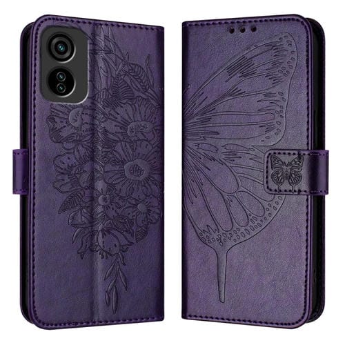 Funda de Cuero para Tecno Pop 6C y Itel A18 con Mariposa en Relieve (Púrpura Oscuro)