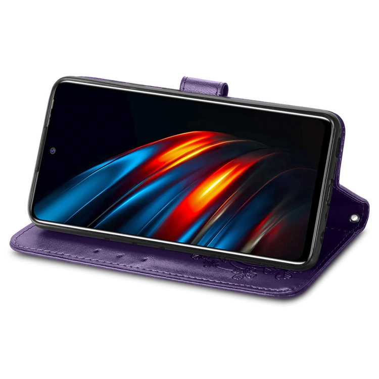 Funda de Cuero para Tecno Pova 2 con Cierre de Cuatro Hojas, Hebilla en Relieve, Ranura para Tarjeta y Soporte (Púrpura)