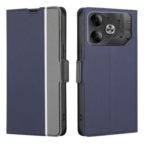 Funda de Cuero para Tecno Pova 6 5G con Botón Lateral y Textura de Sarga (Azul)