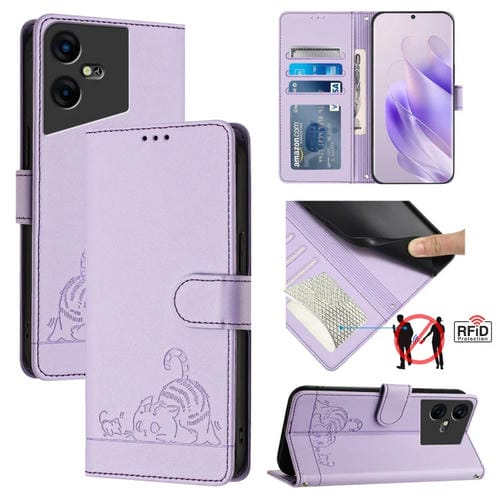 Funda para Tecno Pova Neo 3 Cat Rat Cuero Rfid con Patrón en Relieve y Cordón (Púrpura)