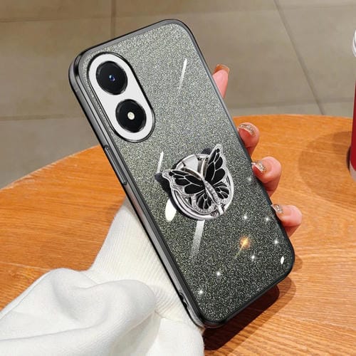 Para Vivo Y02S Funda para Teléfono de TPU con Soporte de Mariposa con Brillo Degradado Plateado (Negro)