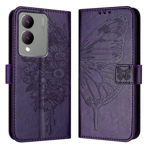 Para Vivo Y17S 4G Global / Y28 5G India Funda para Teléfono de Cuero con Mariposa En Relieve (Púrpura Oscuro)